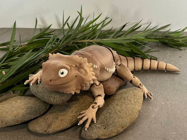 This bearded dragon is printed from start to finish by us here at Wattarah. We ensure a quality print with a smooth, durable design that invites movement and fidgeting. Each animal is fully articulated, crafted to inspire hands-on interaction and sensory engagement. In person the layer lines aren’t always as noticeable, but will always be visible to some degree due to the nature of 3D printing.