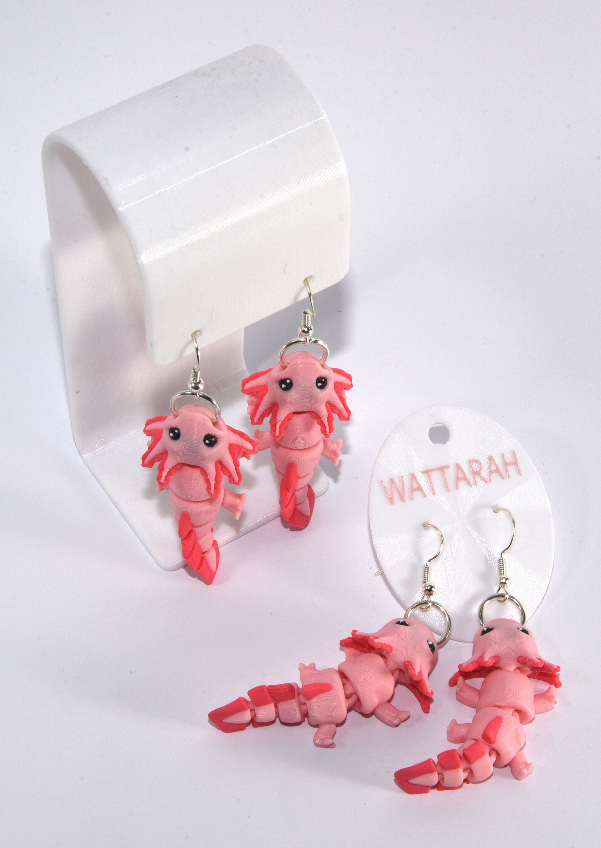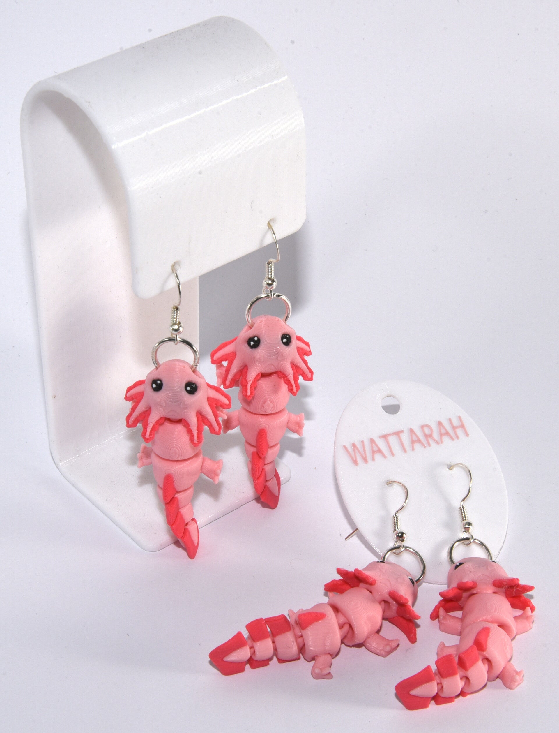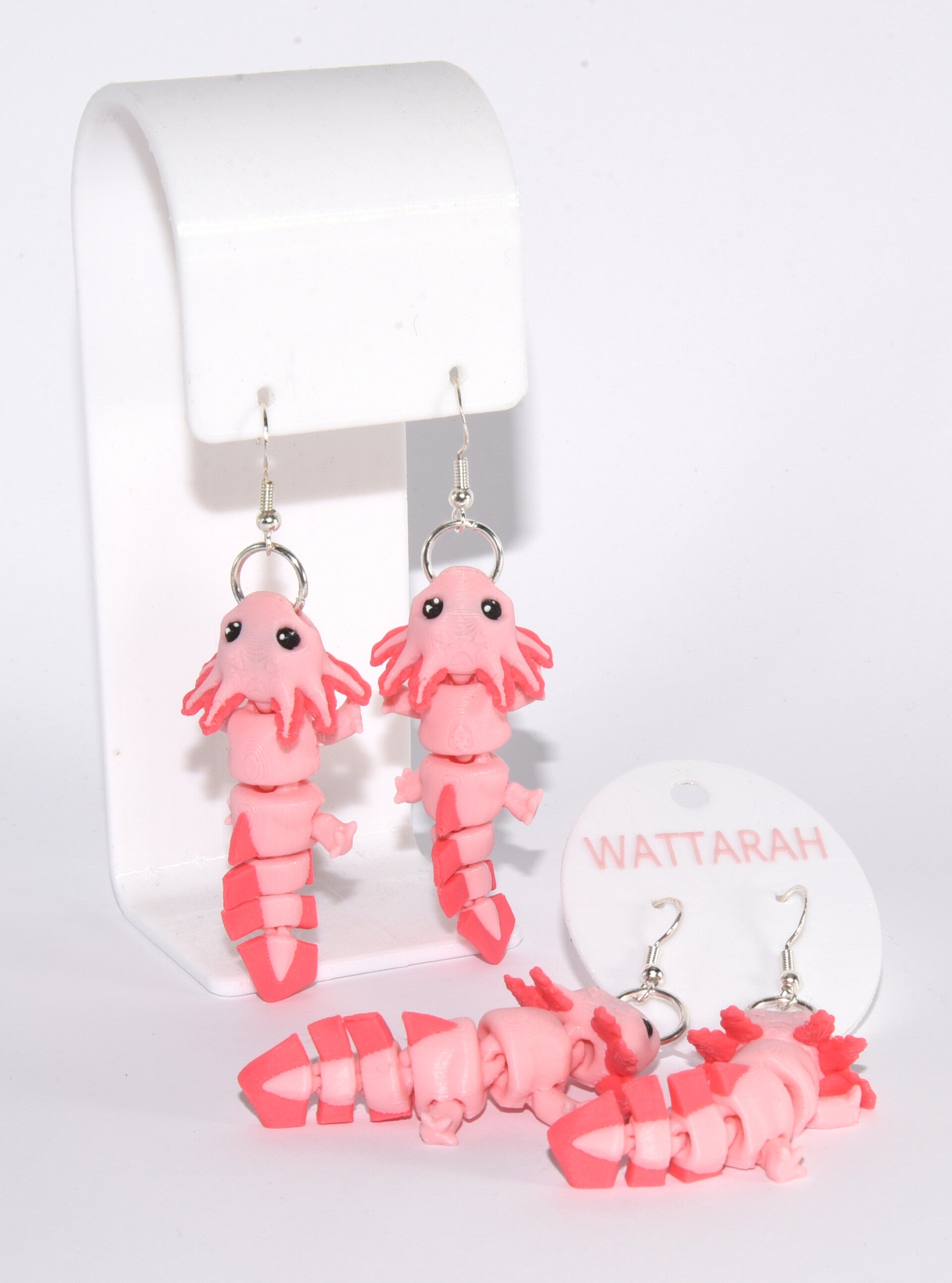 Add a splash of adorable to your outfit with these 3D printed axolotl earrings! Featuring a light pink body with dark pink gills, these little amphibians are full of personality and charm. Perfect for animal lovers, kawaii fashion fans, or anyone who wants to show off a super cute, handmade accessory.