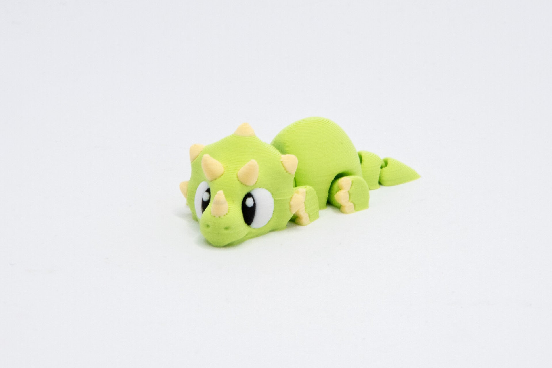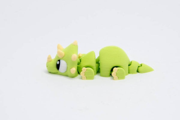 This little triceratops measures approximately 6cm in length, from head to tail, and 2cm tall. Featuring cute smiling face and a green body and yellow spikes, it is 3D printed using eco-friendly PLA. The little triceratops has articulating movement, for a great little wiggle and jiggle from head to tail. Great for sensory, fidget and desk pets.