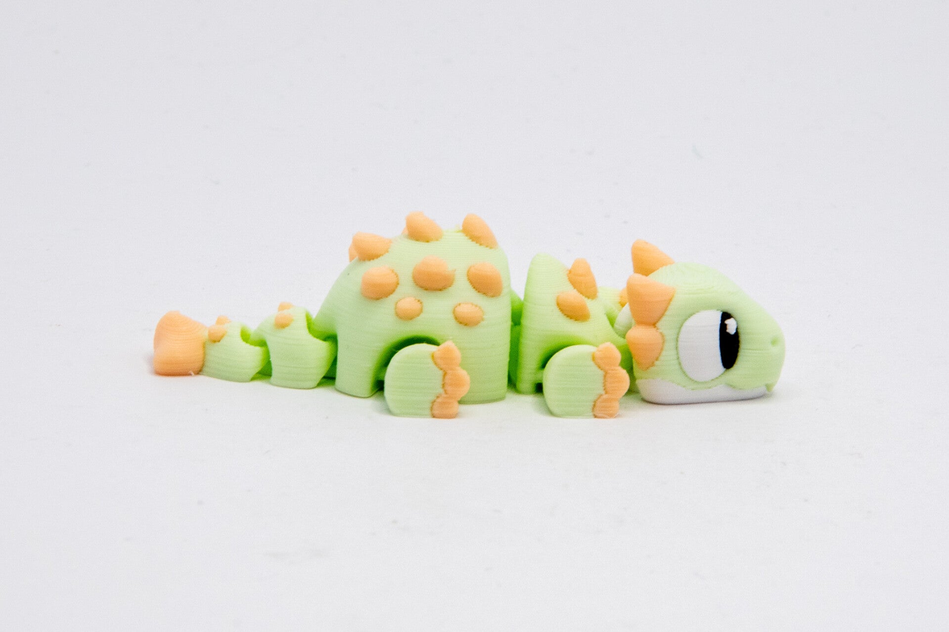 This little Ankylosaurus measures approximately 6cm in length, from head to tail, and 2cm tall. Featuring green body with orange spikes, it is 3D printed using eco-friendly PLA. The little Ankylosaurus has articulating movement, for a great little wiggle and jiggle from head to tail. Great for sensory, fidget and desk pets.
