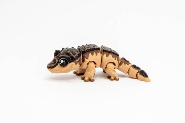 This little gecko measures approximately 7cm in length, from head to tail, and 1.5cm tall. Featuring a cute smiling face with light brown, dark brown and black body, it is 3D printed using eco-friendly PLA. The little gecko has articulating movement, for a great little wiggle and jiggle from head to tail. Great for sensory, fidget and desk pets.