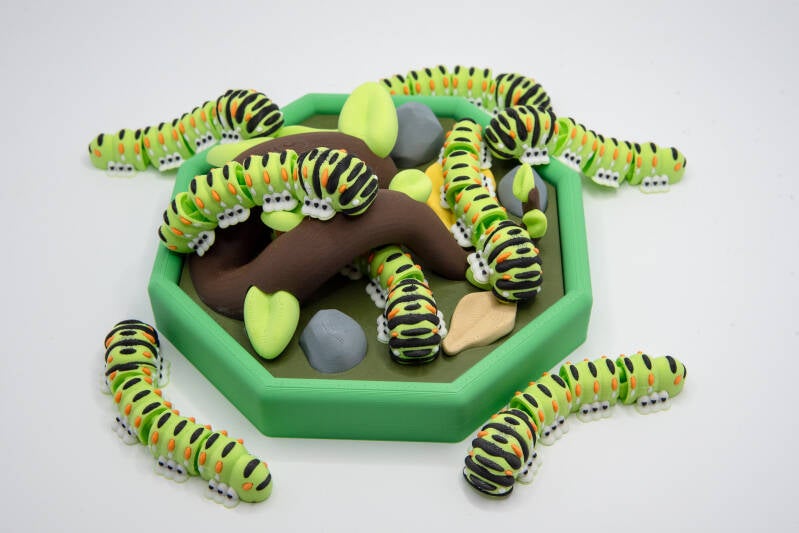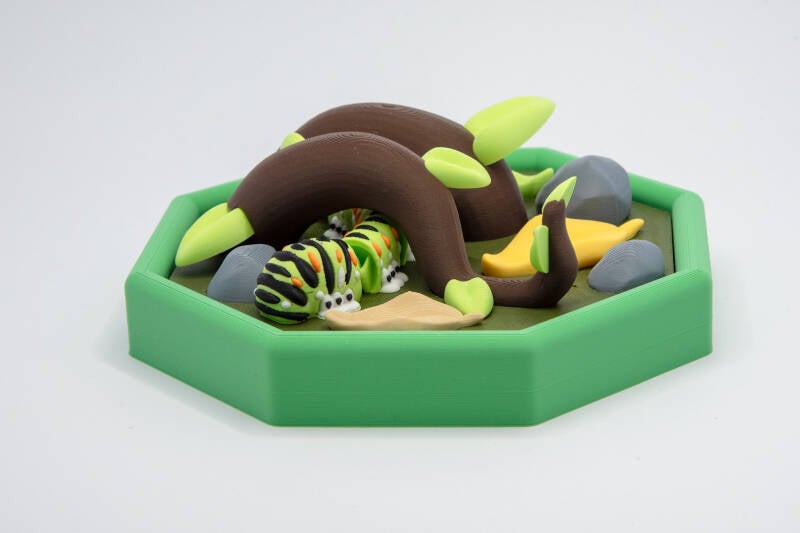 For the insect enthusiasts, this forest floor biome is a close up look at a habitat that caterpillars would love. Including tree root, with fallen leaves and rocks, on a moss green floor, this world may be small, but it is packed with detail. This habitat is a fun mix of play and display that suits kids, collectors, sensory seekers and anyone who loves caterpillars. Great for sensory, fidget and desk pets.